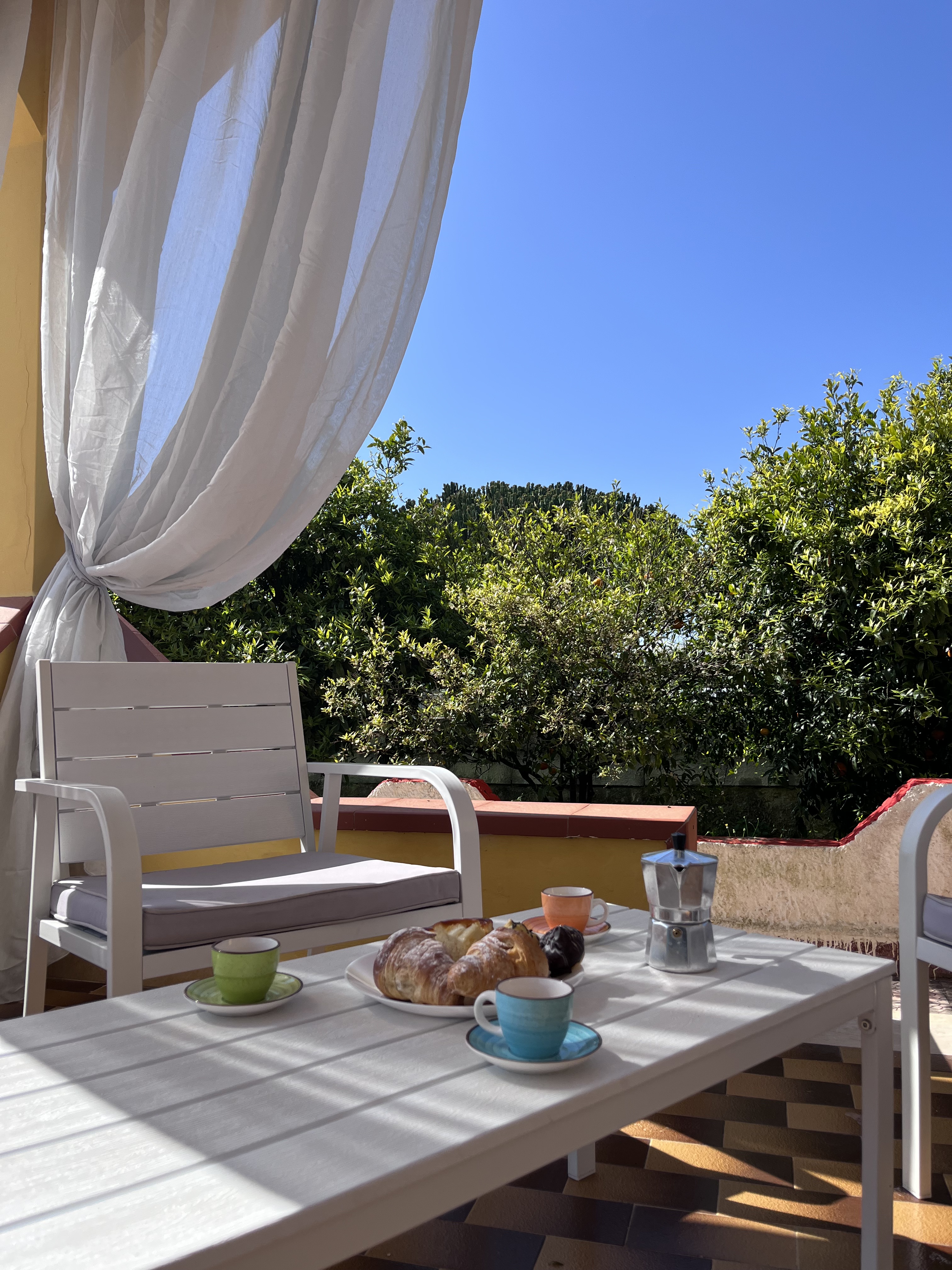 All’esterno, il relax continua: una grande veranda coperta con tavoli e sedie ti invita a goderti la colazione all’aperto, leggere un libro all’ombra o cenare sotto le stelle.