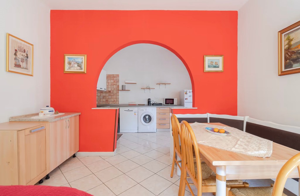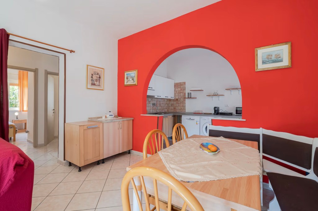 Il cuore della casa è l’ampio soggiorno open space, impreziosito da un arco color corallo che incornicia la cucina.