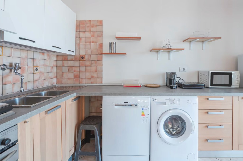 La cucina è completamente attrezzata con tutto il necessario: lavastoviglie, lavatrice, forno, microonde, macchina del caffè e utensili per cucinare in libertà.