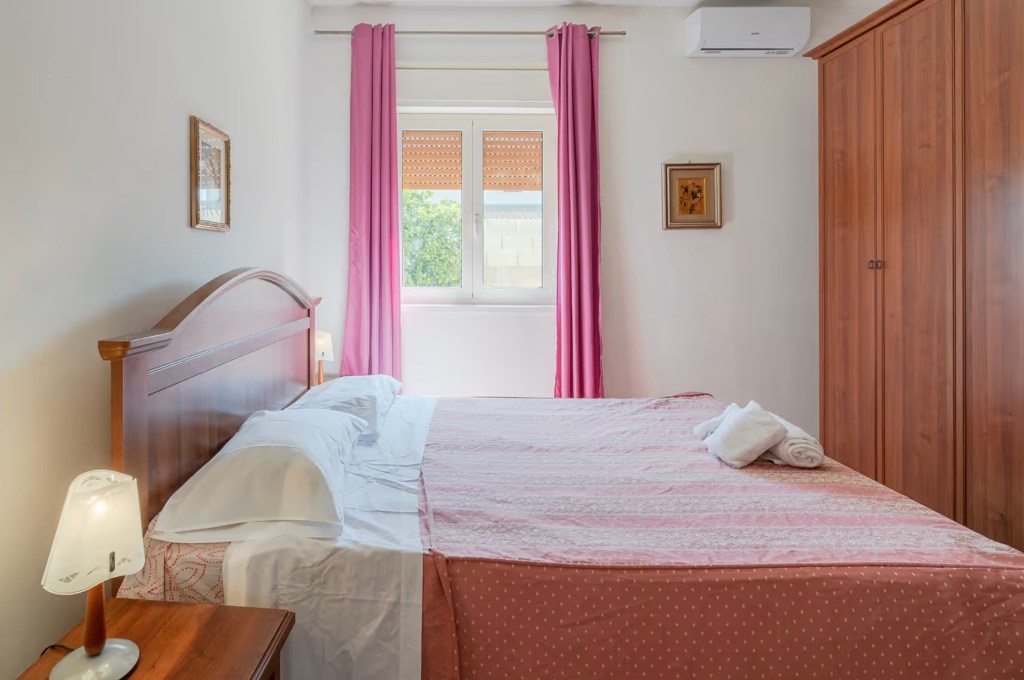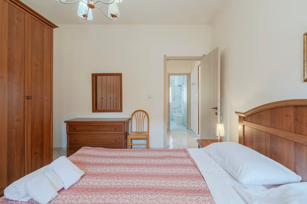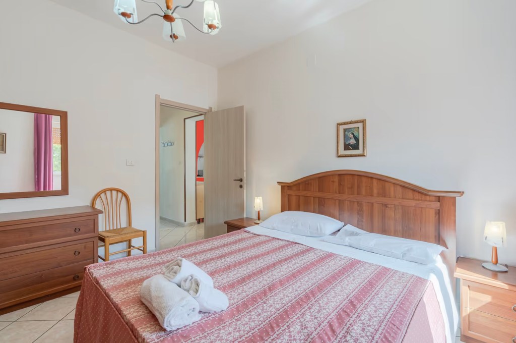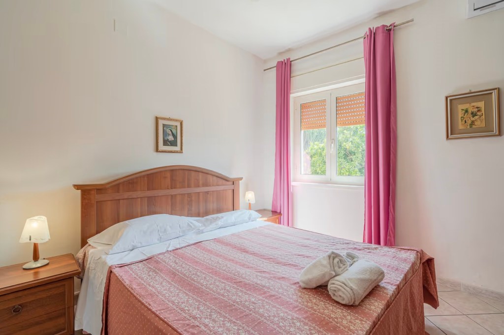 La camera matrimoniale è ampia e confortevole, con colori caldi, aria condizionata e grandi finestre che affacciano sul verde. Perfetta per rilassarsi dopo una giornata al mare.