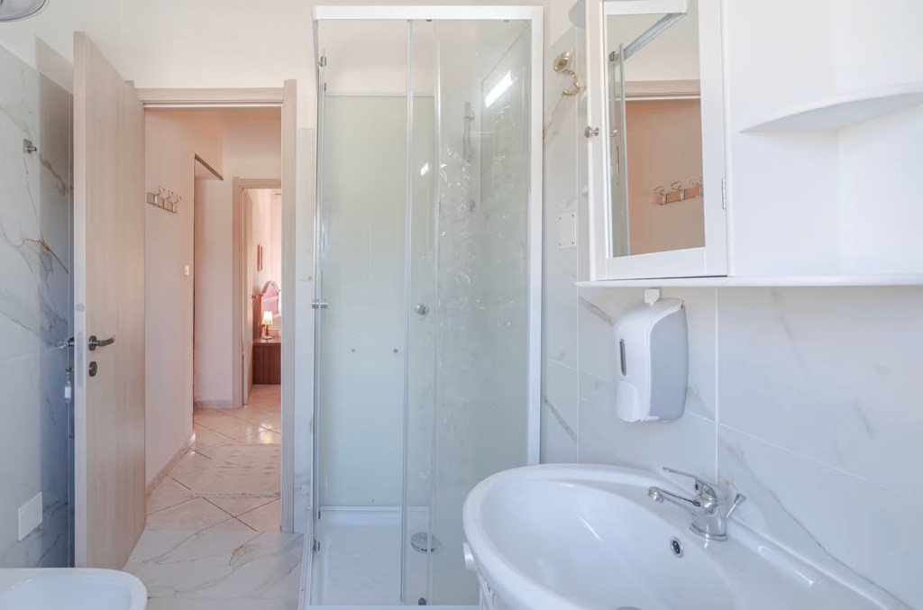 Il bagno, luminoso e funzionale, è dotato di doccia, lavabo, bidet e tutti i comfort essenziali.